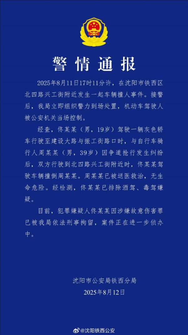 近日,沈阳警方通报,2025 年 8 月 11 日 17 时 11 分许,在沈阳市铁西区北四路兴工街隔壁发生总计车辆撞东谈主事件。接警后,我局立即组织警力到场处分,纯真车驾驶东谈主被公安机关就地截止。经查,佟某某(男,19 岁)驾驶一辆灰色轿车行驶至开荒正途与振工街路口时,与自行车骑行东谈主周某某(男,39 岁)因争谈抢行发生纠纷后,两边行驶到北四路兴工街隔壁时,佟某某驾驶车辆撞倒周某某。周某某已被送医救治,无人命危急。经检测,佟某某已排斥酒驾、毒驾嫌疑。当今,犯科嫌疑东谈主佟某某因涉嫌成心伤