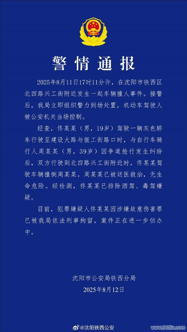 近日,沈阳警方通报,2025 年 8 月 11 日 17 时 11 分许,在沈阳市铁西区北四路兴工街隔壁发生总计车辆撞东谈主事件。接警后,我局立即组织警力到场处分,纯真车驾驶东谈主被公安机关就地截止。经查,佟某某(男,19 岁)驾驶一辆灰色轿车行驶至开荒正途与振工街路口时,与自行车骑行东谈主周某某(男,39 岁)因争谈抢行发生纠纷后,两边行驶到北四路兴工街隔壁时,佟某某驾驶车辆撞倒周某某。周某某已被送医救治,无人命危急。经检测,佟某某已排斥酒驾、毒驾嫌疑。当今,犯科嫌疑东谈主佟某某因涉嫌成心伤害罪已被我局照章刑事拘留,案件正在进一步侦办中。