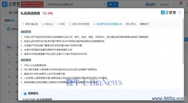 企查查 APP 自满,该岗亭条目应聘者有 3 年以上礼品销售训戒,主要细腻公司居品在所在区域内礼品渠说念如礼品公司、银行、航空、保障、石油石化、政企功绩单元等的销售 , 完成部门销售方针等。