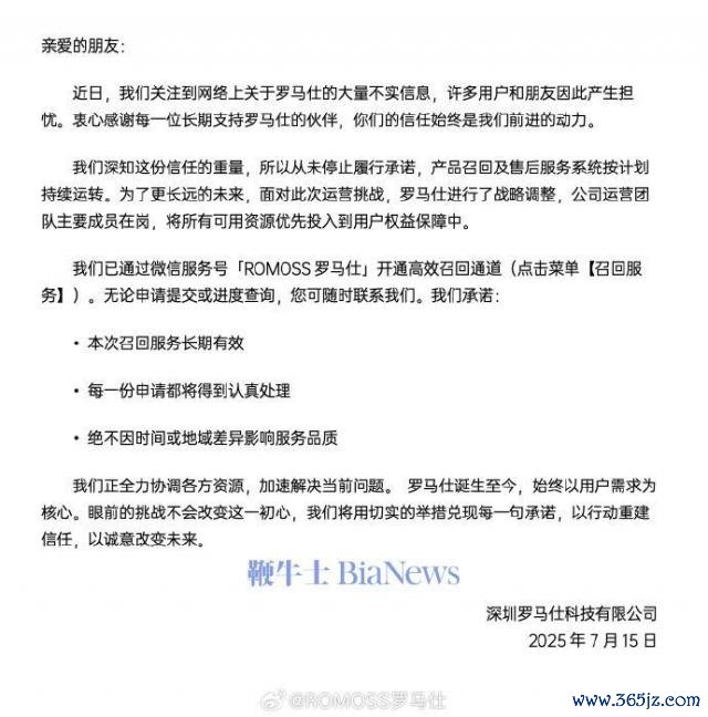 7 月 15 日,罗马仕再发文,称已绽开居品的高效调回通。官方还默示,面临这次运营挑战,罗马作念官行了策略调理,公司运营团队主要成员在岗,将悉数可用资源优先参加到用户职权保障中。